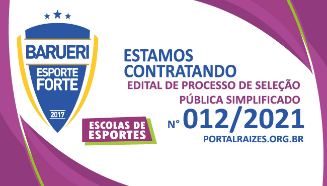 O INSTITUTO DE CIDADANIA RAÍZES, CNPJ nº 04.079.198/0001-00, visando à contratação de pessoal para a execução das ações e serviços PROGRAMA BARUERI ESPORTE FORTE, conforme descrito no Contrato de Gestão Número 537/2019, celebrado entre o Município de Barueri e o Instituto de Cidadania Raízes, torna pública a realização de Processo de Seleção Pública Simplificado n.º 009/2021, que será regido pelas normas estabelecidas neste Edital.