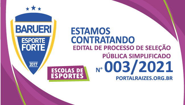 O INSTITUTO DE CIDADANIA RAÍZES, CNPJ nº 04.079.198/0001-00, visando à contratação de pessoal para a execução das ações e serviços PROGRAMA BARUERI ESPORTE FORTE CNPJ nº 04.079.198/0007-97, conforme descrito no Contrato de Gestão Número 537/2019, celebrado entre o Município de Barueri e o Instituto de Cidadania Raízes, vem por meio deste, convidar fornecedores a apresentar proposta para prestação de serviços especializados em alimentação e nutrição para alunos/atletas do Programa Barueri Esporte Forte, no período de 01/02/2021 a 19/09/2021.